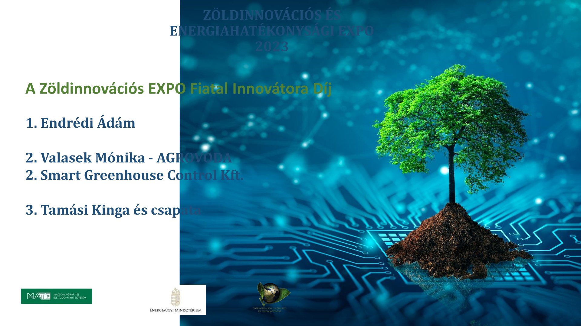 Az MBH Bank Nyrt. által támogatásával Az év zöld mezőgazdasági innovátora Díjat első helyen a BUSA Bt. vehette át a forgókapás műszaki innovációjáért. A második helyezésért járó díjat megosztva az innovatív szárítórendszer kifejlesztésért a Dryerdoctor Kft. és a fólia vezérlő rendszer kimunkálásáért a Smart Greenhouse Control Kft. vehette át. Harmadik helyen végzett Valasek Mónika döntéstámogató vízgazdálkodási AGROVODA pályázata. A Nemzeti Agrárgazdasági Kamara Pest Vármegyei és Fővárosi Szervezete és a Magyar Díszkertészek Szakmaközi Szervezete által támogatott Az év zöld mezőgazdasági innovációja Díjat első helyen a Greenbee Dekor Kft. vehette át magpapír fejlesztésével. Megosztott második helyen szerepelt a MATE Környezettudományi Intézet Öntözés és Vízgazdálkodási Kutatóközpontja, valamint az Albiter Kft. A harmadik helyezett ebben a kategóriában is megosztott lett, melynek nyertesei az Aquaprofit Tervező és Építő Zrt., valamint az Óbudai Platán Könyvtár Ezüsthegyi Könyvtára.